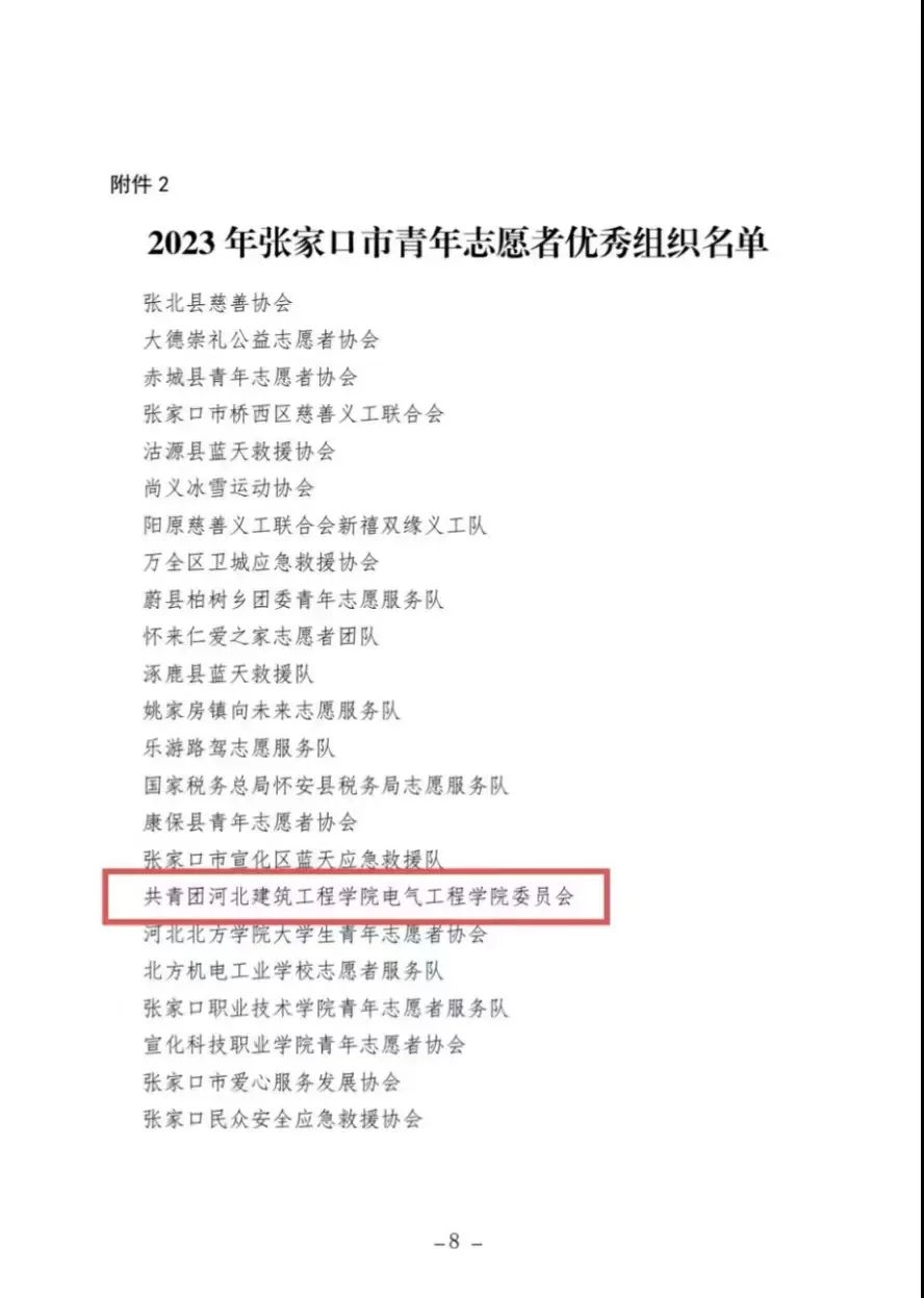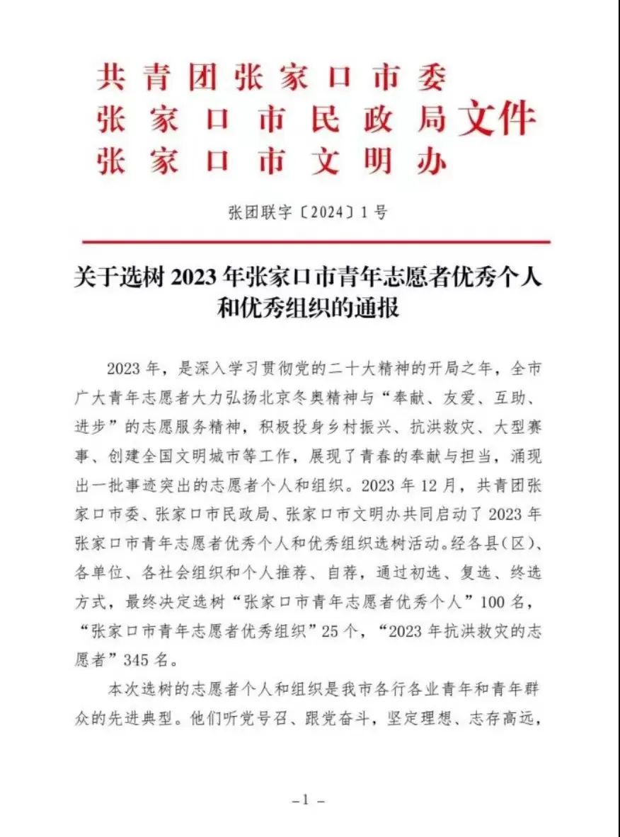 近日,由共青团张家口市委、张家口市民政局、张家口市文明办下发了《关于选树2023年张家口市青年志愿者优秀个人和优秀组织的通报》,太阳成集团tyc234cc主页团委在此次评选中荣获“张家口市青年志愿者优秀组织”称号。