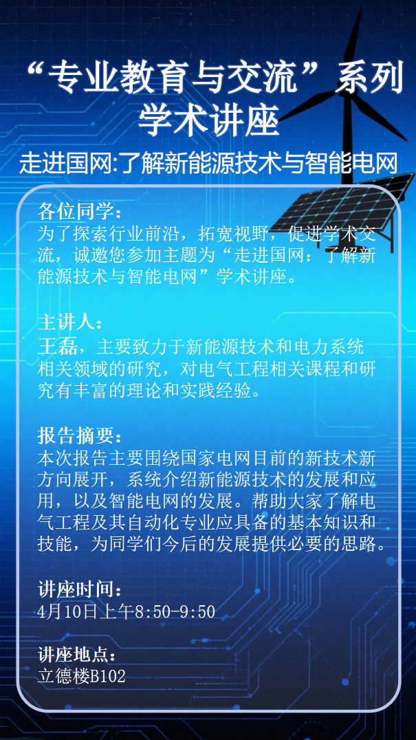 太阳成集团tyc234cc主页“专业教育与交流”系列学术讲座第五讲预告:《走进国网:了解新能源技术与智能电网》