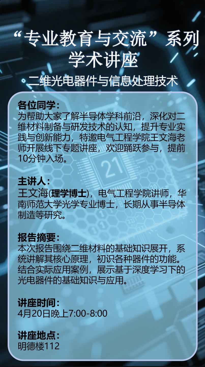 太阳成集团tyc234cc主页“专业教育与交流”系列学术讲座第六讲预告: 《二维光电器件与信息处理技术》
